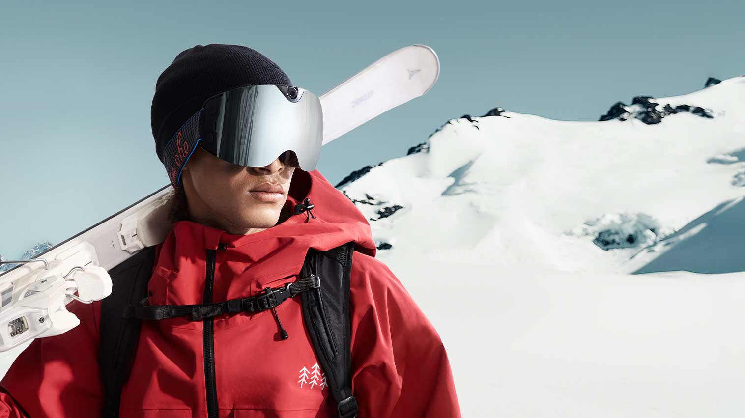 Gafas de esquí inteligentes OhO Sunshine Skyshot con cámara 4K para grabar videos en Ultra HD y tomar fotos. Lente plateada.