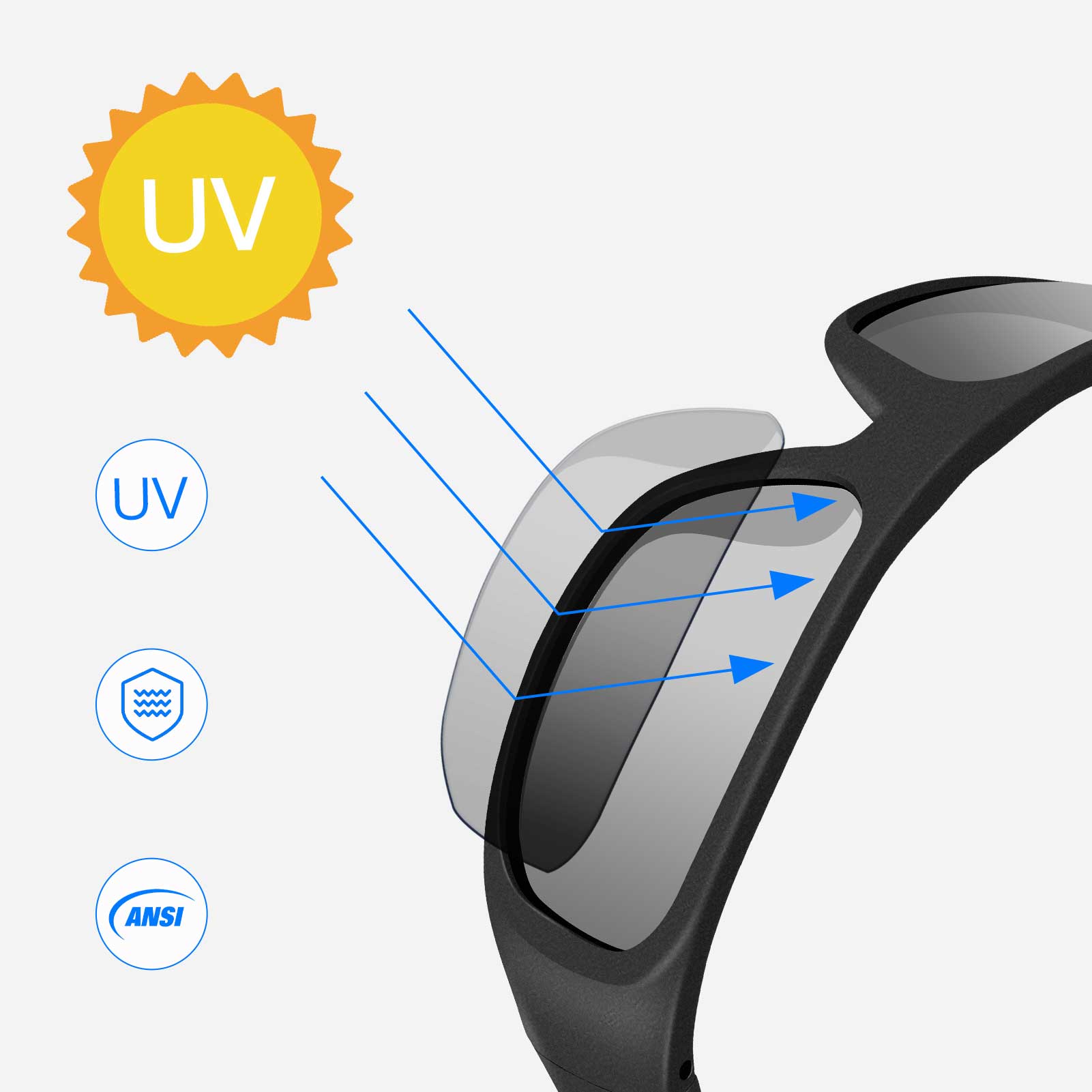 LENTES Y MONTURA RESISTENTES A IMPACTOS: Estándar de seguridad estadounidense ANSI/ISEA Z87.1-2015 para lentes resistentes a impactos, protección ocular y facial, 100 % protección UV400. Lentes polarizados con acampanado para todo tipo de deportes al aire libre.